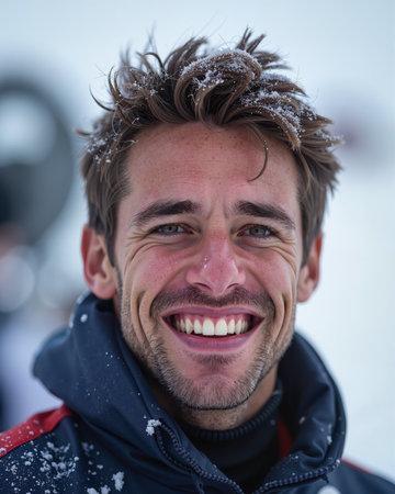 Man with short brown hair and stubble, smiling with squinting eyes, showing white teeth, with snowflakes on his hair and jacket, conveying joy and happiness.