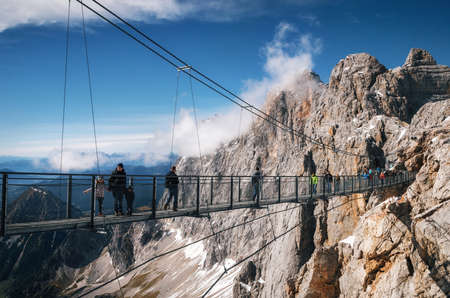 Ramsau am Dachstein, Austria - October 2, 2017: Tourists walk on suspension rope bridge Sky Walk in Dachstein Mountain