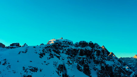 Breathtaking view on beautiful snowy mountains - a tourist building house - Dolomites, Italy