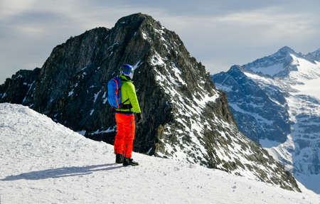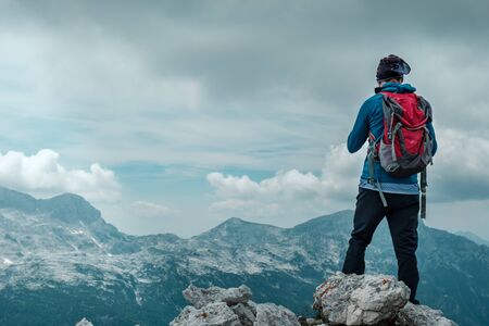 View of the guy from the back who looks at the high alpine mountains