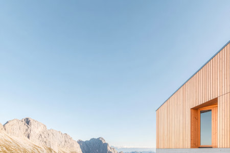 A contemporary wooden cabin sits against a backdrop of majestic mountains. The clear blue sky enhances the tranquil atmosphere creating a perfect retreat for nature lovers.