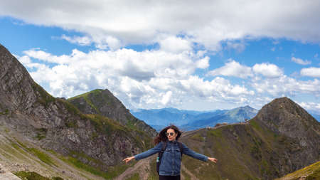 A young female tourist on top of a mountain on the panorama background. Happiness and a sense of freedom, travel in the mountains, the power of nature