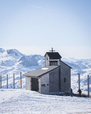 Small chapel on a snowy landscape surrounded by mountains,vertical, Austria, Europe