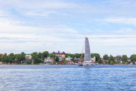Modern catamaran sails smoothly over Stockholm sound, catching the wind. freedom, adventure, joy of exploring open waters on a perfect sailing day in a Baltic sea