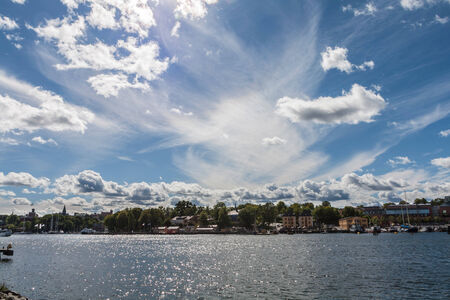 Houses and harbour at Skansen Stockholm next to the river and boats