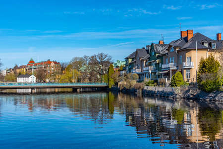 Beautiful buildings stretched alongside Svartan river in Orebro, Sweden
