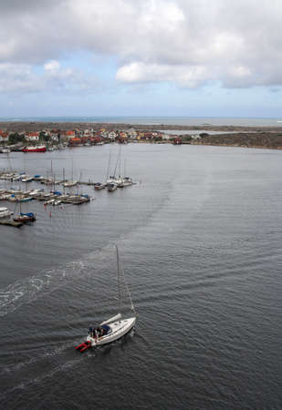 Yacht under Norwegian flag leaving the marina of Swedish fishermen village.