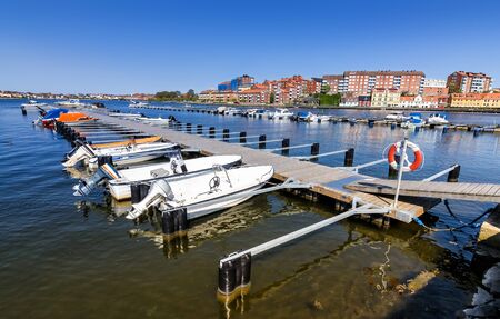 Trosa, Sweden August 6, 2015: Leisure boats moored at the harbor along the outflow of Trosa river into the Baltic sea. Trosa is an idyllic and historic seaside town south of Stockholm and a popular tourist destination during summer time.