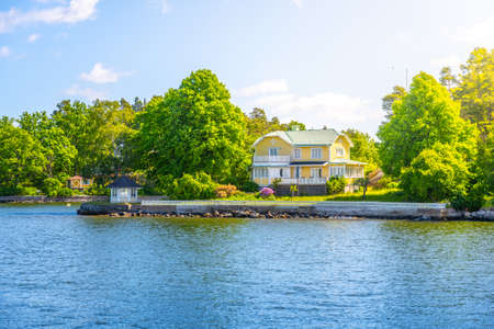 Charming Swedish houses along Stockholm fjord coast. Idyllic Nordic summer travel destination, perfect for vacation, relaxation, and exploring Scandinavian lifestyle