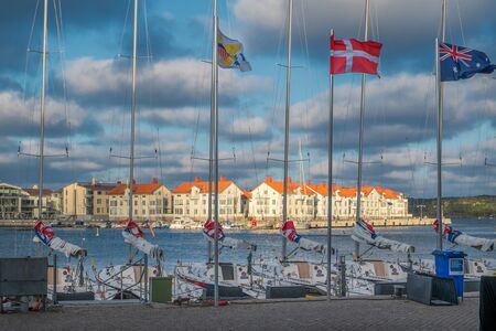 Marstrand, Sweden – July 2, 2014 Match race sailing boats moored at a quay in Marstrand Located in the archipelago north of Gothenburg Marstrand is a famous fishing village which hosts many sailing regattas