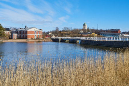 Suomenlinna Church, old bridge, old military buildings on island near Helsinki city, capital of Finland.