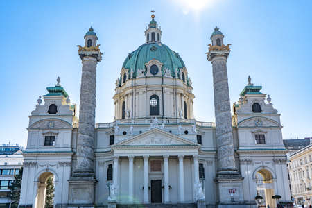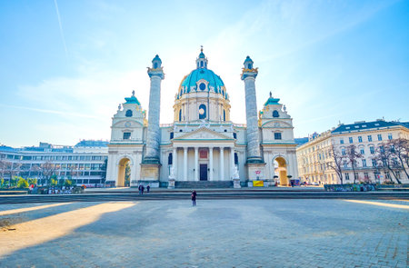 VIENNA, AUSTRIA - FEBRUARY 18, 2019: The Karlskirche Church with its carved high Roman style columns is the main landmark on the Karlsplatz square, on February 18 in Vienna.