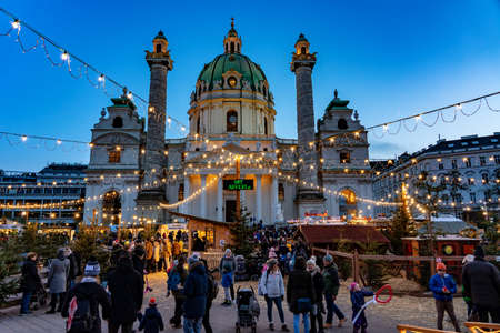 Vienna, Austria - 11.23.2019 : art christmas advent market in Vienna at the Karsplatz with many people