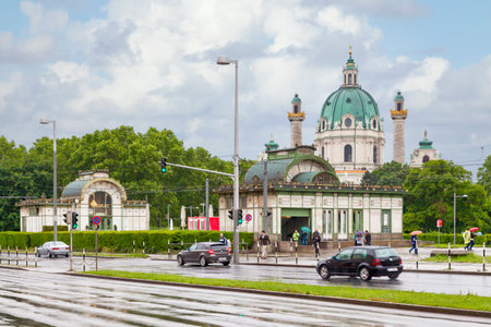 Vienna, Austria - May 29 2019: Karlsplatz Metro Station (German: Stadtbahn-Station Karlsplatz) is an Otto Wagner's ornate Art Nouveau pavilion at Karlsplatz station, housing a dedicated art exhibition.