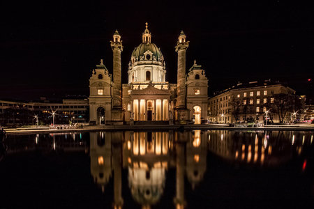 an ultra wide night shot of st charles church reflected in a pool at vienna