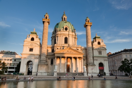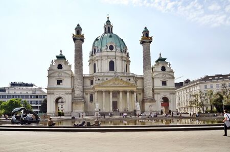 VIENNA, AUSTRIA - SEPTEMBER 26, 2013: Saint Karl Borromey's well-known church in Baroque style. On the square big pond