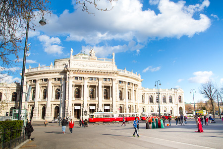 Vienna, Austria - April 3, 2015: Front facade of Burgtheater, red tram and people on the square, Vienna, Austria. Blue cloudy sky background