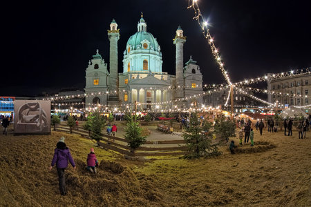 VIENNA, AUSTRIA - DECEMBER 9, 2016: Karlsplatz Christmas market at Karlskirche church. Ðn area in front of the church reserved for children’s activities: piles of straw, pony rides, farm animals, etc.
