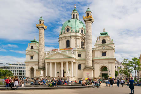 31 May 2019 Vienna, Austria - Karlskirche in cloudy springtime day. Many tourists on streets. Art landmark