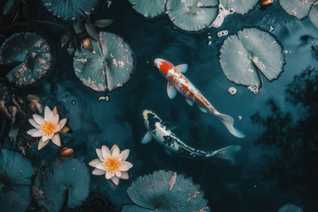 A serene pond scene featuring vibrant koi fish swimming gracefully among delicate white blossoms, creating a peaceful and calming atmosphere in nature.
