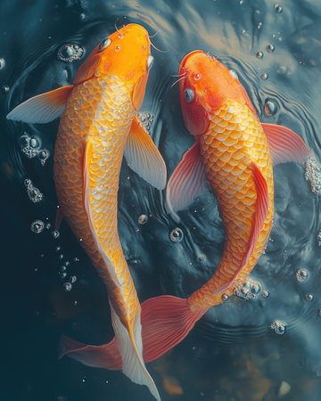 Two koi fish with orange and gold scales swim in clear water. The composition is an overhead shot, revealing intricate patterns and textures. The image uses a shallow depth of field, with soft, diffused lighting. It is suitable for various commercial uses, including illustrations and educational materials.