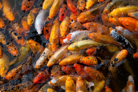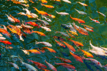 Detail of colorful Koi Fishs or Koi Carp swimming inside the fish pond at sunny day, Japanese fish species, Many colorful patterns, No focus, specifically.