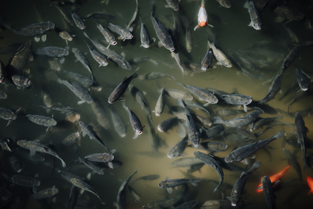 A large accumulation of carps in a clear lake