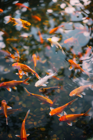 Koi carps swimming in a pond seen from above the water surface