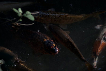 JapJapan koi fish or Fancy Carp swimming in a black pond fish pond. Popular pets for relaxation and feng shui meaning. Popular pets among people. Asians love to raise it for good fortune.an koi fish or Fancy Carp swimming in a black pond fish pond. High quality photo