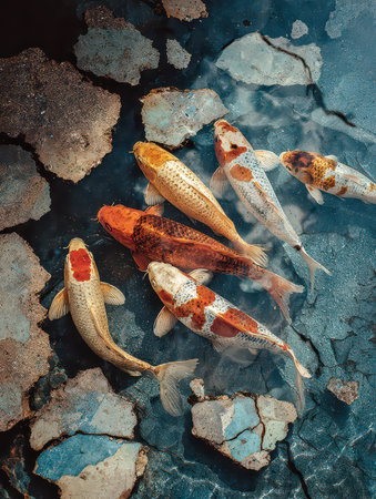 A stunning arrangement of vibrant koi fish swimming gracefully in clear water, surrounded by a cracked surface, showcasing the beauty of nature's tranquility.
