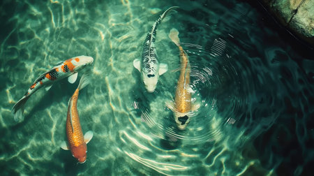 Four vibrant koi fish elegantly swim in a clear pond, creating ripples in the sunlight. This captivating scene embodies tranquility and natural beauty.