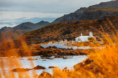 Agios Fokas near Monemvasia. Small cemetery graveyard on sea shore in Laconia region Peloponnese.