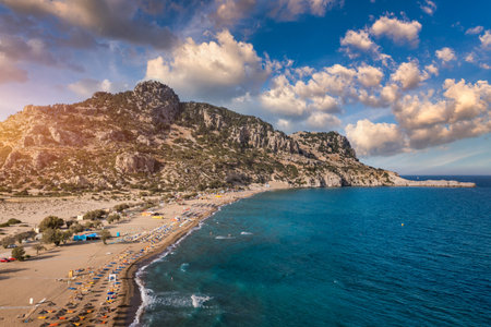 Tsampika beach with golden sand view from above, Rhodes, Greece. Aerial birds eye view of famous beach of Tsampika, Rhodes island, Dodecanese, Greece