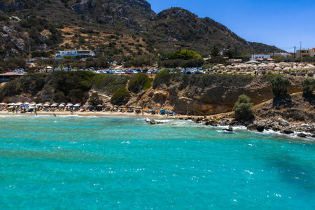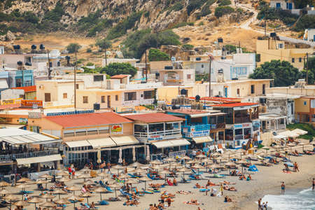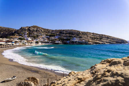 Crete Island, Greece, June 09, 2017: Panorama of Matala beach. Caves on the rocks were used as a roman cemetery and at the decade of 70's were living hippies from all over the world, Crete, Greece