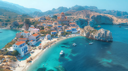 Tranquil Greek fishing village with whitewashed houses fishing boats