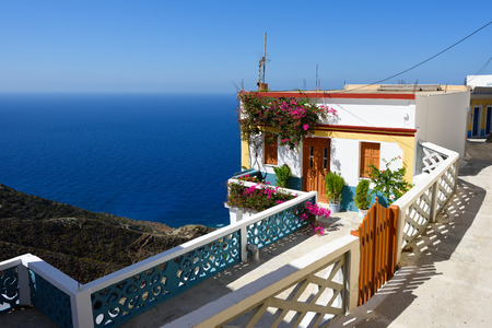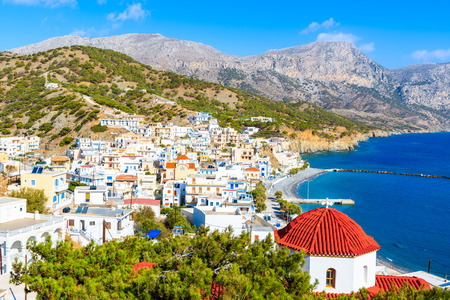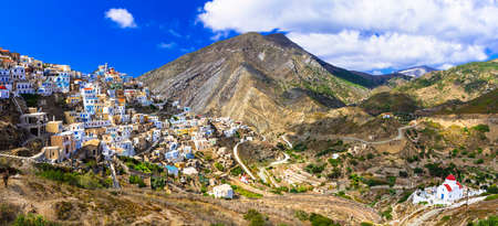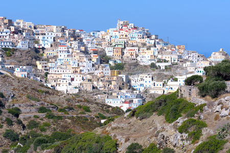Panorama of the hillside colorful homes in the old tradition village Olympos in Karpathos island, Dodecanese Greece