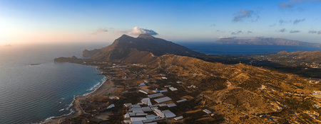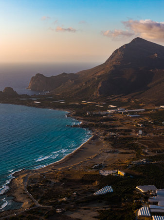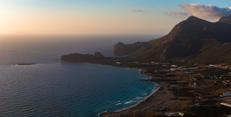 Aerial View of Coastal Landscape and Mountain on Crete Island at Sunset