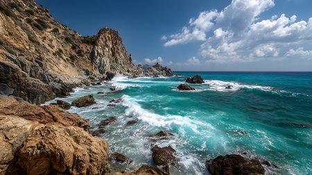Stunning view of turquoise waves breaking along a rocky coast with tall cliffs, under a vibrant blue sky dotted with fluffy white clouds. Beautiful coastal scenery.