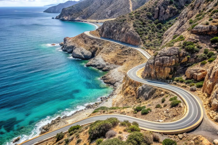 An aerial shot showcases a coastal road winding alongside vibrant turquoise waters. The composition features rocky outcrops, lush green vegetation, and a single vehicle. Overhead lighting and the natural color palette create a visually appealing scene, suitable for travel or environmental themes in various commercial applications.