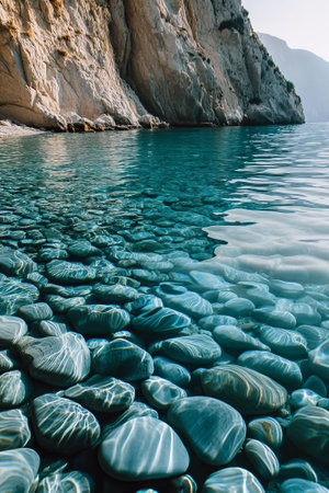 Experience the breathtaking beauty of a rocky coastline with crystal clear turquoise waters. This serene landscape evokes a sense of peace and tranquility in nature.