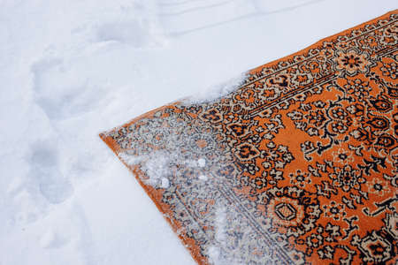 Carpet is lying onsnow. Old Persian carpet in red shades of color is turned upside down and sprinkled with snow on top to clean it