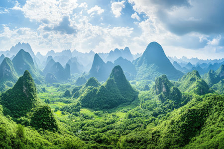 Xianggong Hill viewpoint panorama of beautiful green, lush and dense karst mountain landscape in Yangshuo, Guangxi Province, China