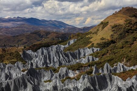 Bamei stone forest, exotic pillars of gray stone situated in the grasslands of Sichuan Province, China. Unique rock formations with clouds in the distant background. Martian Tibetan Landscape