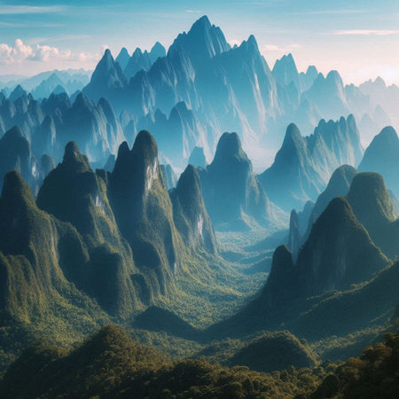 Majestic Southeast Asian mountain range with mist-covered peaks, serene landscape, no people