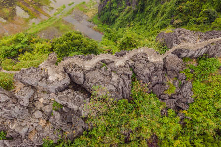 Hang Mua Mountain viewpoint or Mua Caves Ecolodge, Stunning view of Tam Coc area with mountain range, rice fields and waterway.