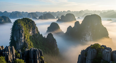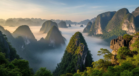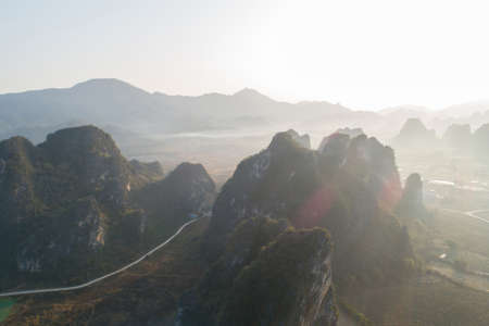 Aerial view of beatiful sunrise over karst mountain peak landscape