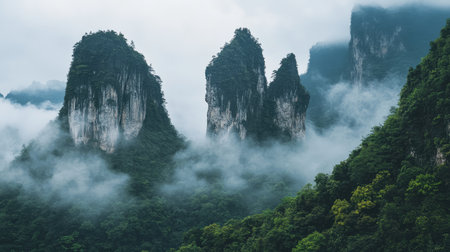 Discover breathtaking mountain peaks cloaked in mist, surrounded by lush forests. This serene landscape captures nature's untouched beauty and tranquil atmosphere.