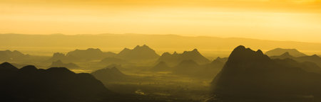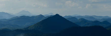 A panoramic landscape of mountain ridges with twilight sky and clouds at Phu Kra Dung National park of Thailand