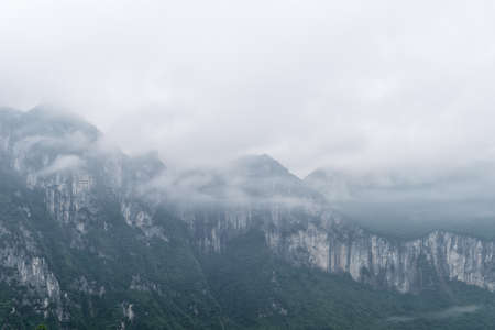 sheer cliffs and steep mountains in cloud mist, hubei province, China
