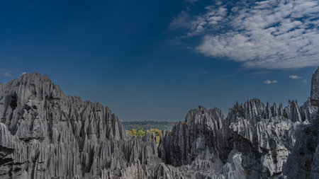 The incredible unique cliffs of Madagascar. Steep, furrowed slopes, sharp peaks against a background of blue sky and clouds.Tsingy De Bemaraha
